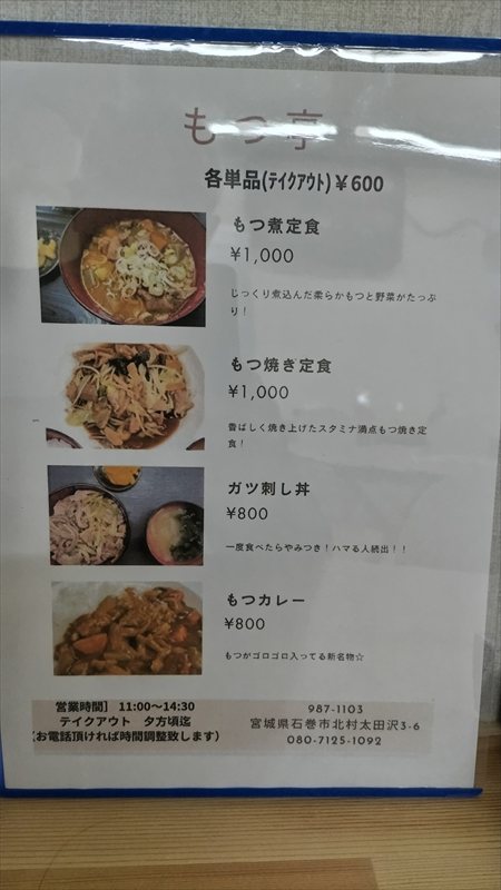 メニューは4種類、「もつ煮定食」「もつ焼き定食」「ガツ刺し丼」「もつカレー」となっています。